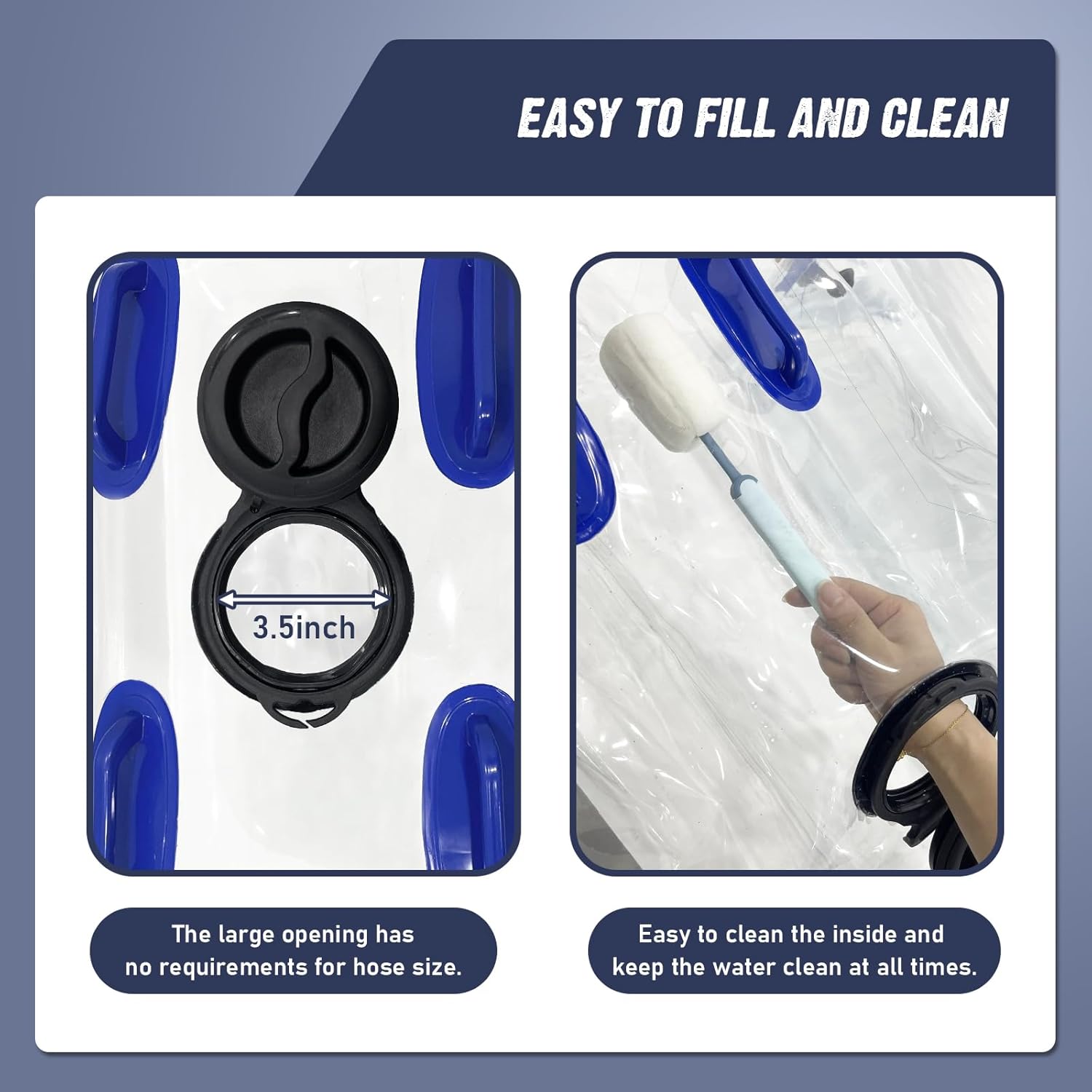- INNOVATIVE DESIGN WATER CONTAINER: Our high transparency material enhance the visibility of the water container to avoid water stored in the dark color bladder with invisible dirt effectively. Help keep your water clean for washing and flushing. Molded-in graduation marks in gallons & liters allow easy monitoring of water volume in real time.