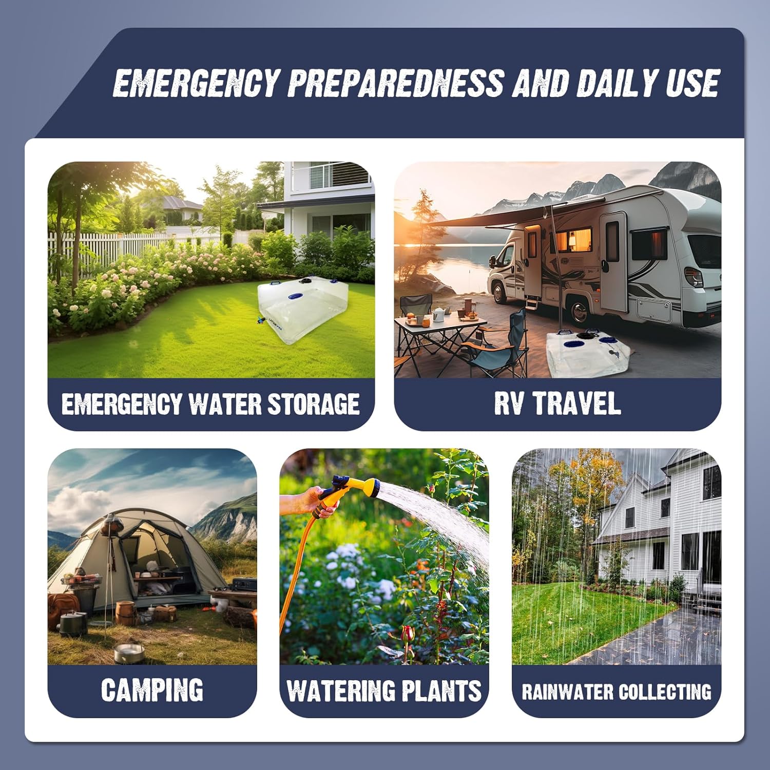 - EMERGENCY PREPAREDNESS AND DAILY USE: Our collapsible water storage bladder come in all the accessories you need and enable you to quickly & conveniently be ready to store, transport & dispense all the water, without taking up much space before you need it. Perfect for storing water for sanitation & hand-washing stations and being prepared for natural disasters & unwanted emergencies. Notes: This product is not suitable for drinking water and corrosive substances.