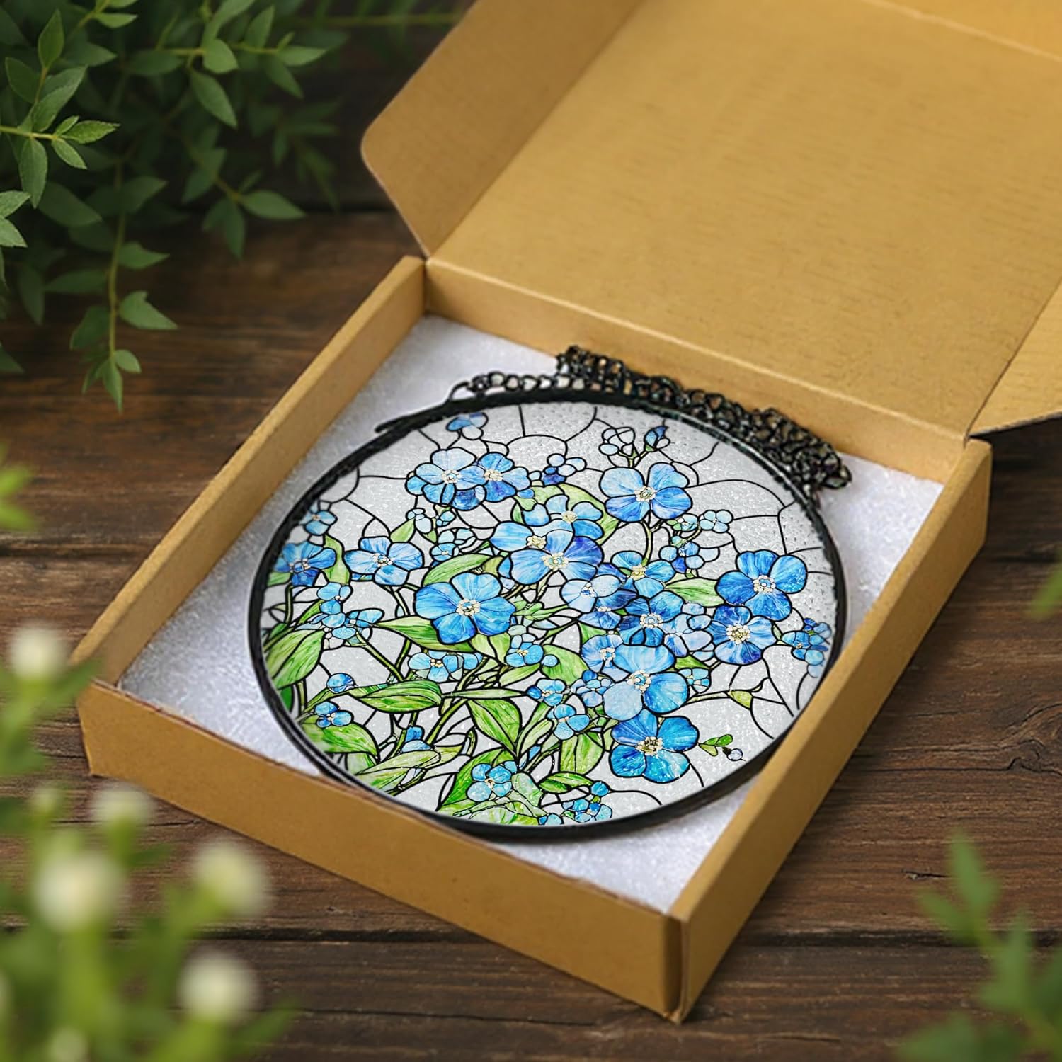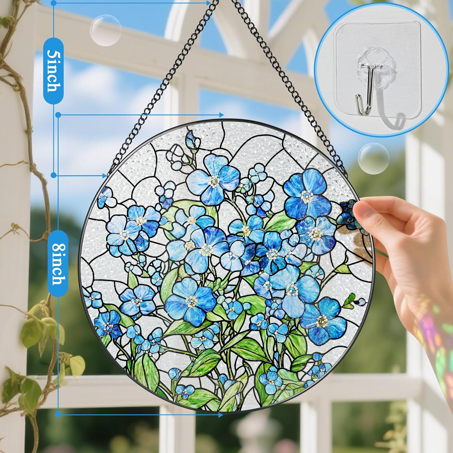 Stained Glass Window Hanging, 8 Inch Forget Me Not Stained Glass Suncatcher, Window Hanging Decor, Flower Sun Catchers, Gifts for Flower Lover, Birthday Gifts for Lover, Friend, Family, Teacher