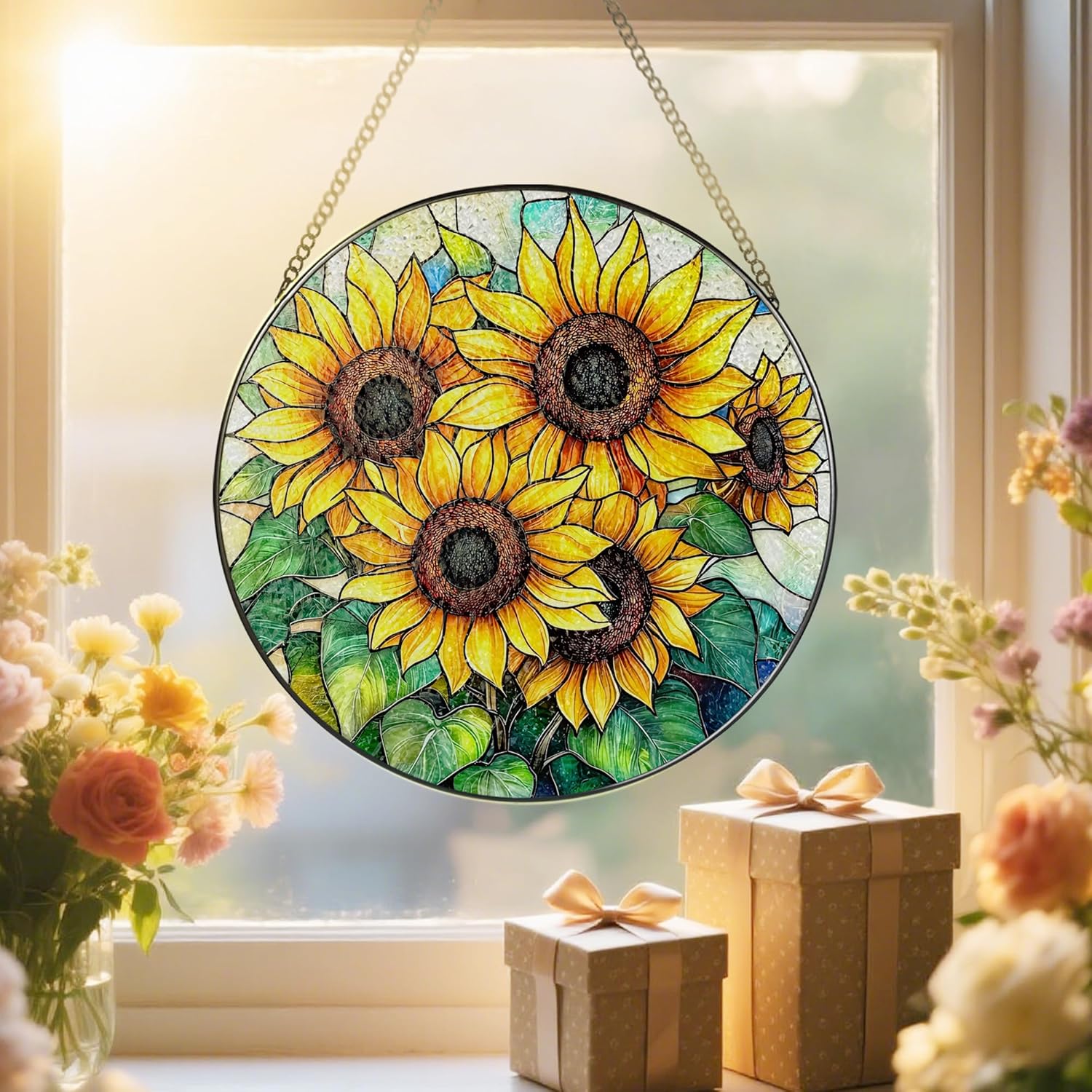 Stained Glass Window Hanging, 8 Inch Sunflower Stained Glass Suncatcher, Suncatchers for Windows Hanging, Home Decor for Window, Teacher Gift, Birthday Gift, Sunflower Gifts for Women, Friend