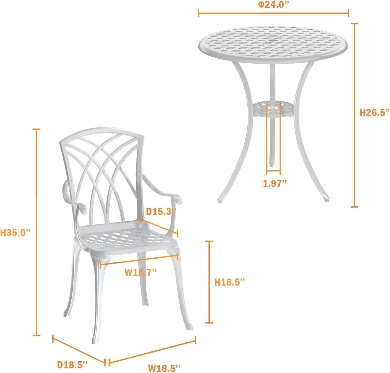 - ăDurable Cast AluminumăMade of anti-rust, weather-resistant cast aluminum, making bistro set perfect for long-term outdoor use in any climate