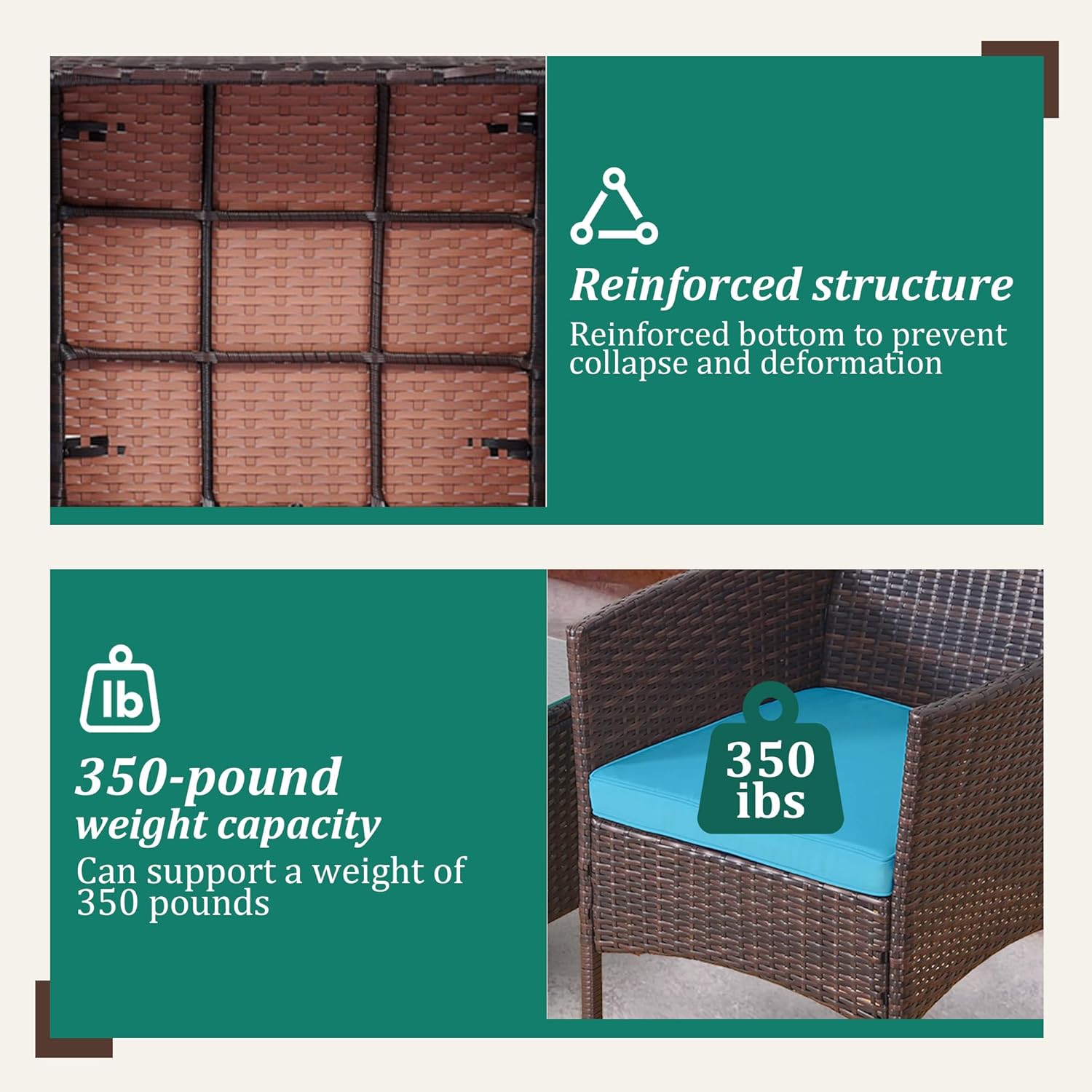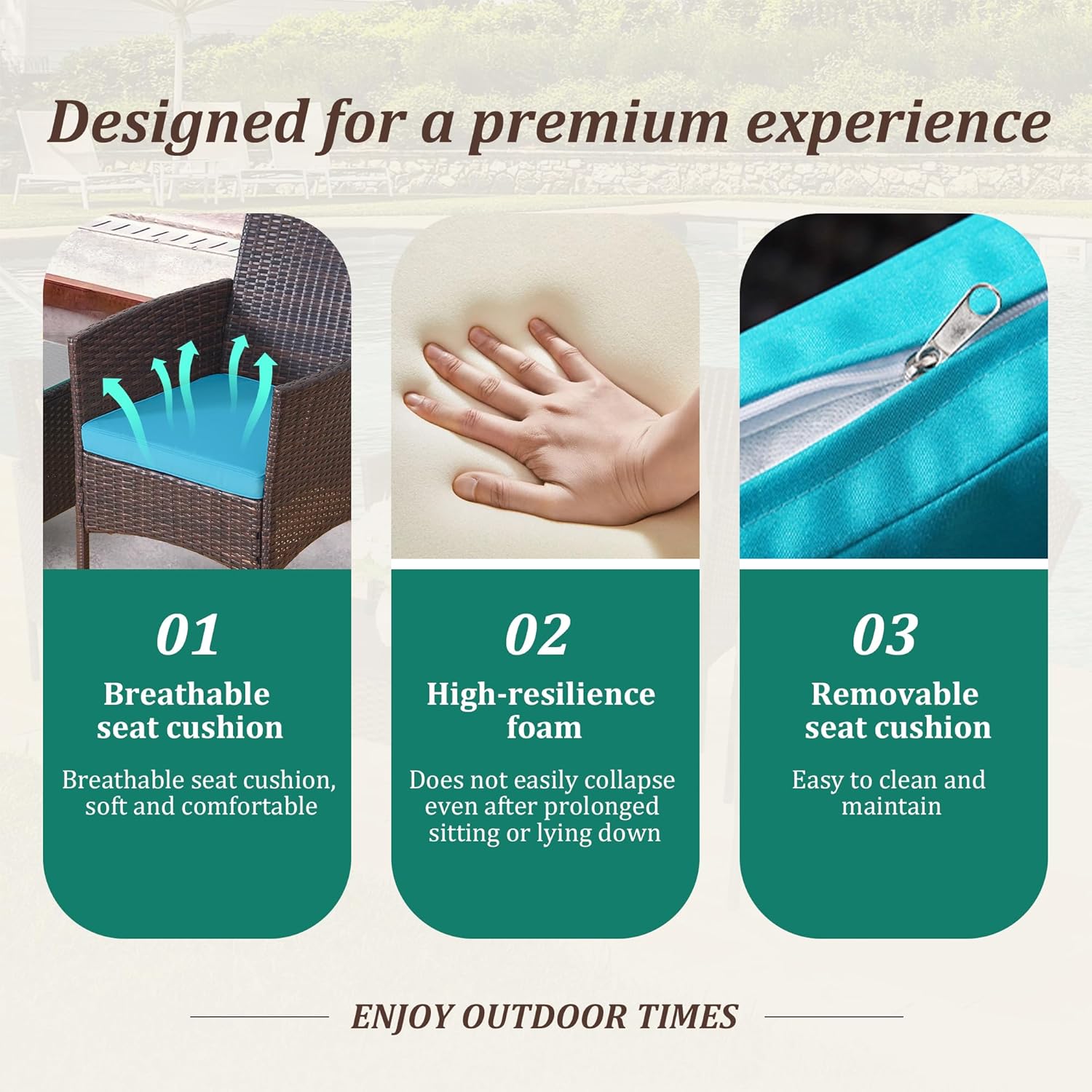 - 【Complete 3-Piece Set】 Includes 5 main furniture (1 Coffee Table + 2 Chairs + 2 Seat Cushions). Everything needed for instant outdoor living