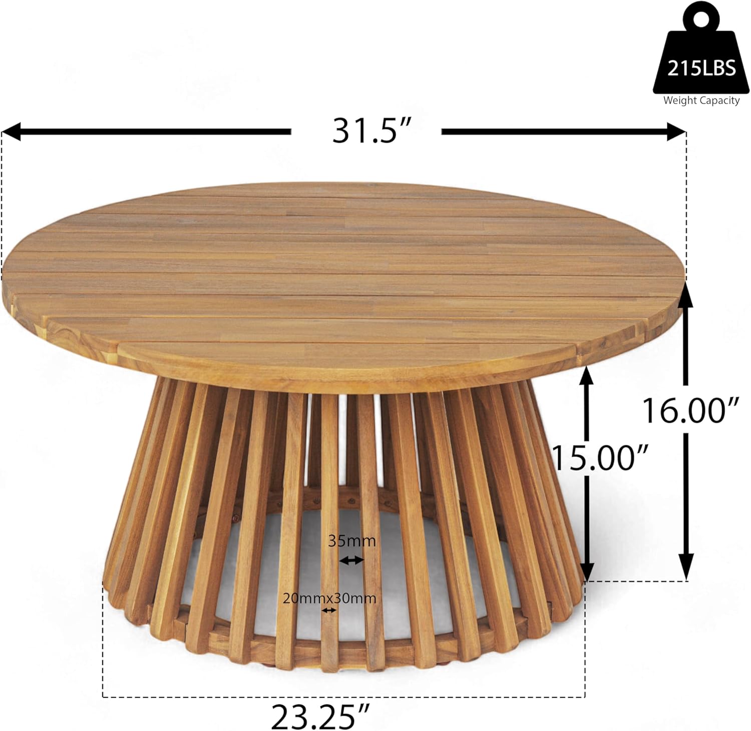 - Round Outdoor Coffee Table: With a slatted base and circular top, the 16β high coffee table supports up to 215 lbs. Ideal for drinks, snacks, or dΓ©cor, it adds both practicality and elegance, completing the look of your outdoor living area with ease