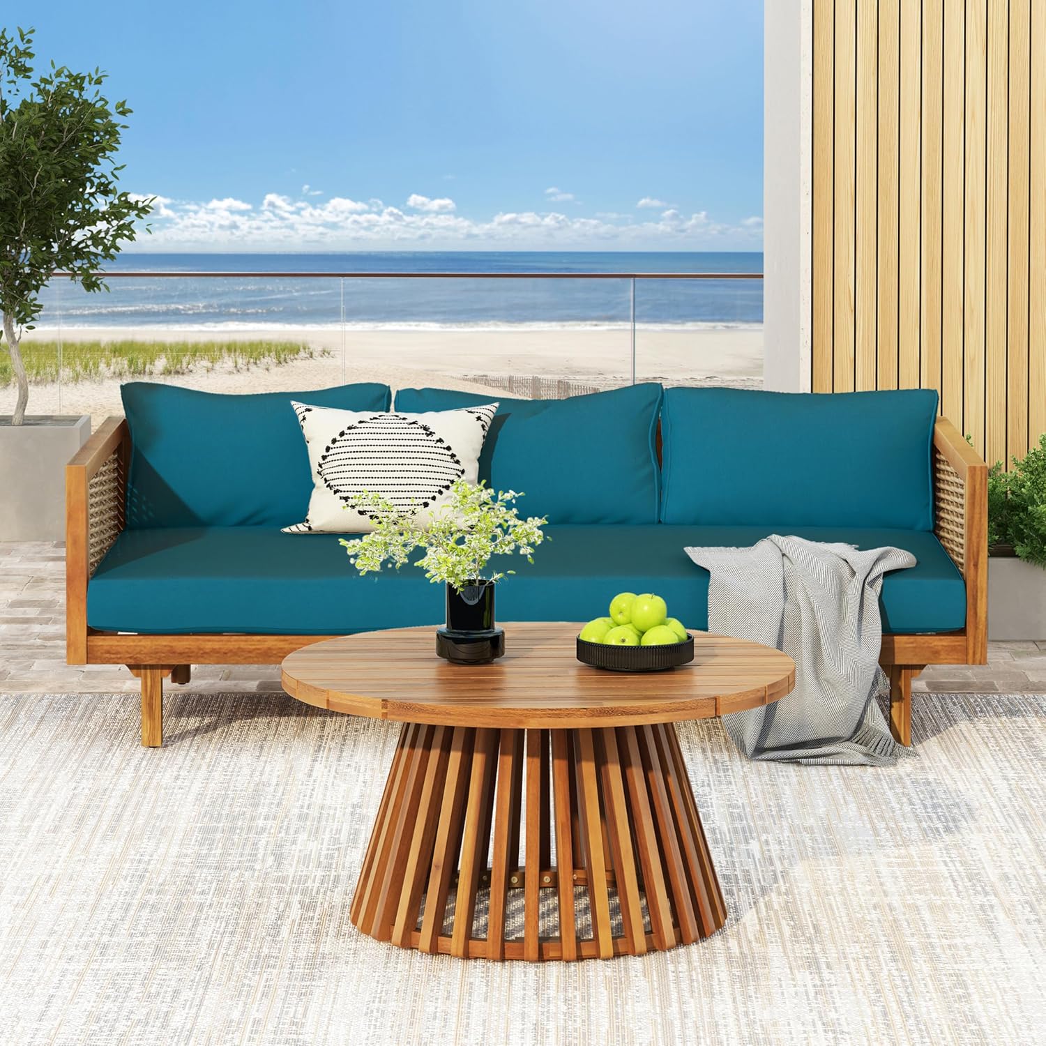 - Round Outdoor Coffee Table: With a slatted base and circular top, the 16β high coffee table supports up to 215 lbs. Ideal for drinks, snacks, or dΓ©cor, it adds both practicality and elegance, completing the look of your outdoor living area with ease