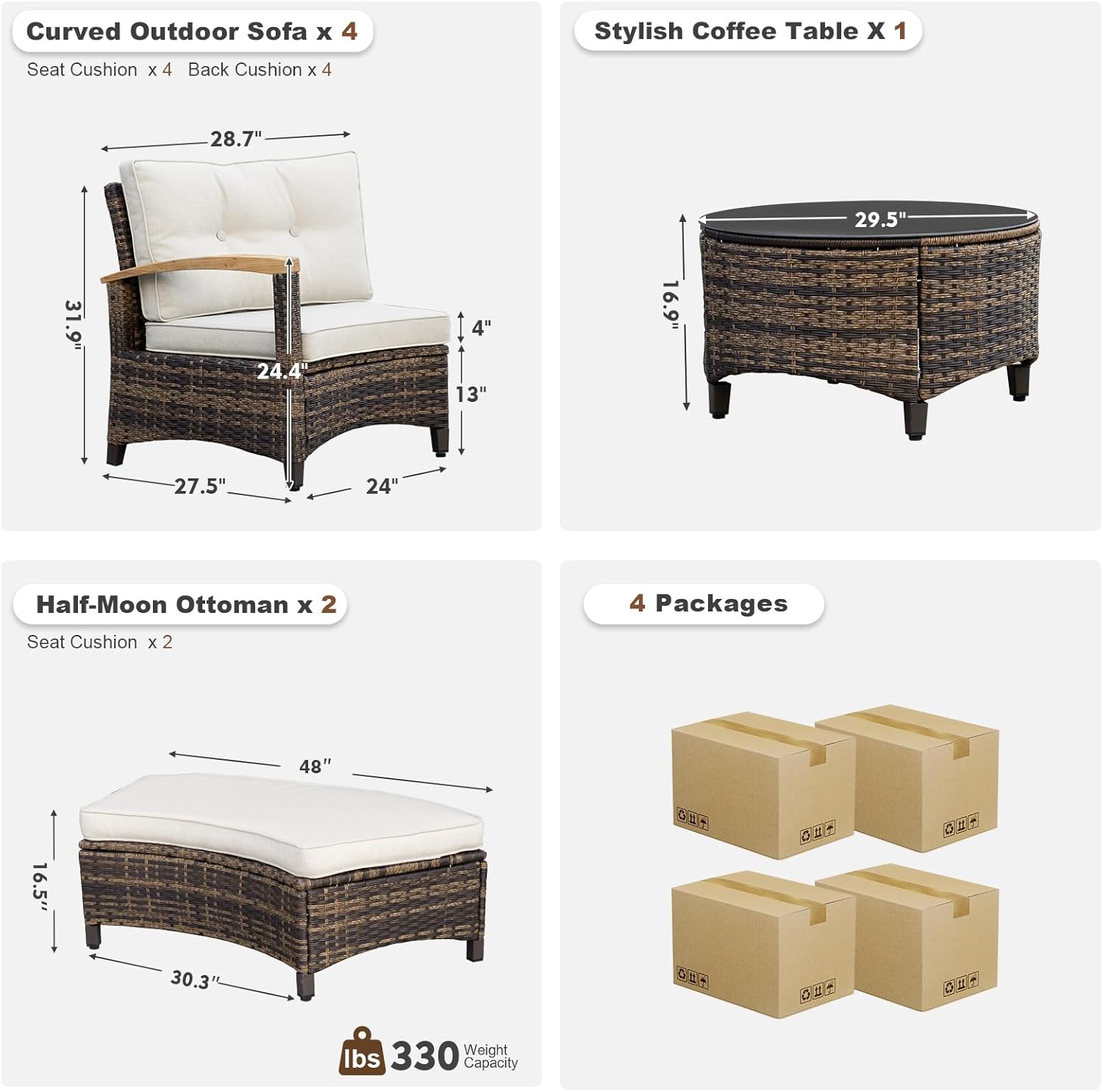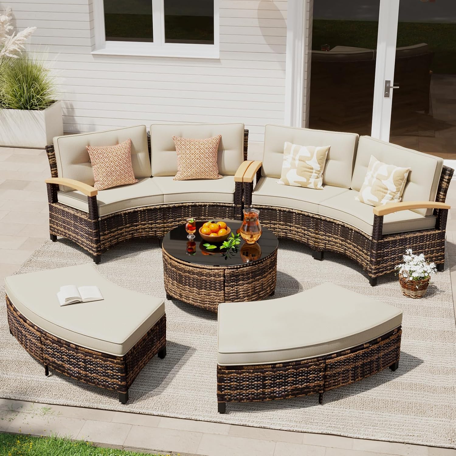 - Unique Half-Moon Design: This half-moon patio furniture set features a stylish semi-circular lounge with four curved sofas and two Half-Moon Ottomans, perfect for outdoor gatherings on your balcony, patio, or poolside
