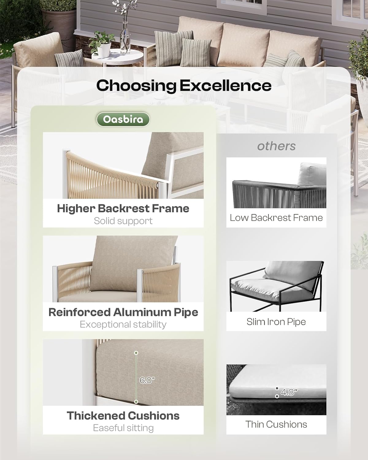 - 【Ultimate Comfort】 This item is shipped in 3 boxes and may not be delivered at the same time.The cushions of the Oasbira patio furniture set are filled with honeycomb structure foam, offering exceptional comfort. This outdoor seating furniture features an elevated backrest frame reaching 29.4 inches, providing support that far beyond average patio sets. Each seat is 23.6 inches wide, offering ample space and ensuring ergonomic relaxation.