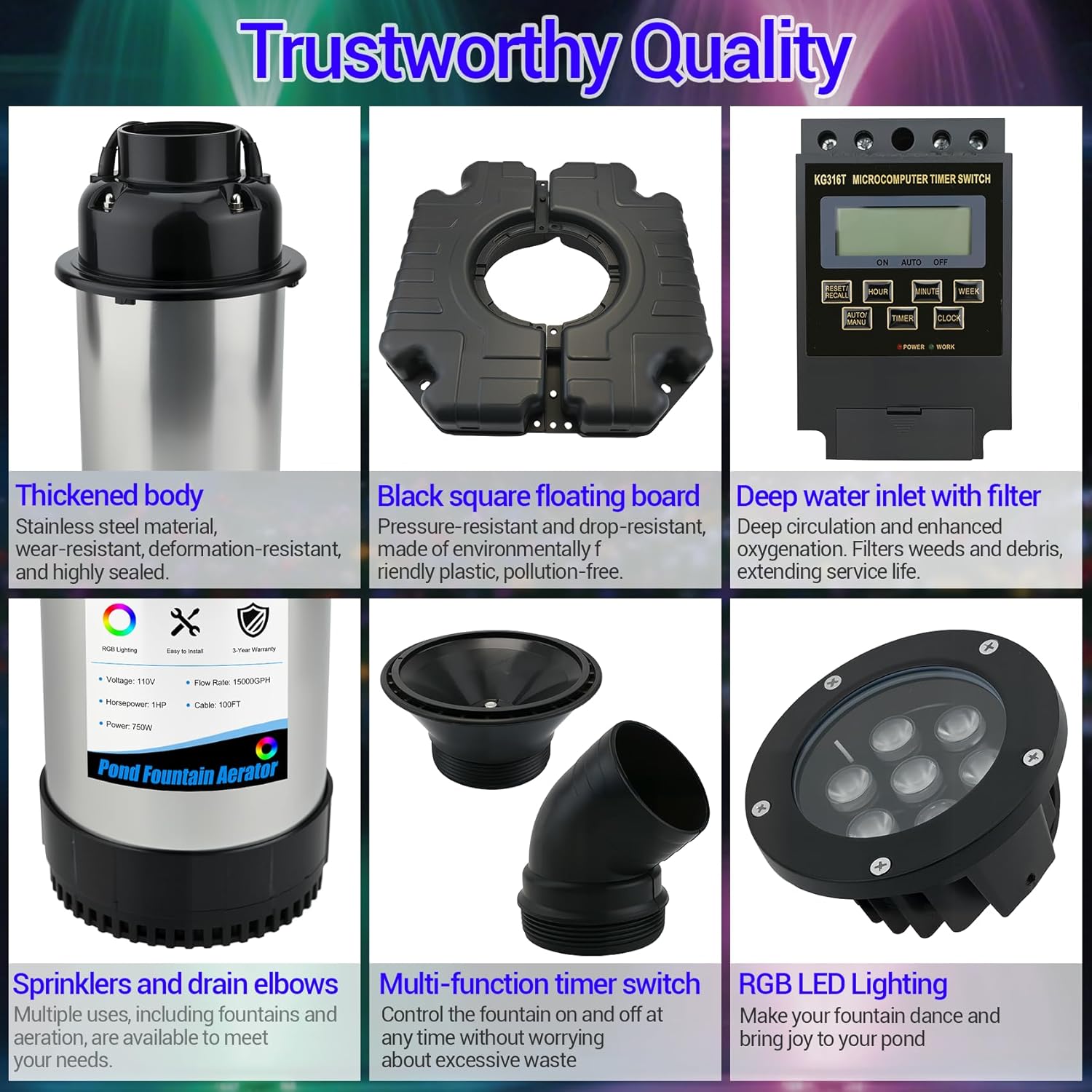 - [Powerful Performance]: Our 1HP 110V lake aerator fountain is suitable for ponds, fishponds, and lakes of all sizes. This floating pond aerator boasts a powerful 15,000 gph, 750 watts of power. It also comes with a 100-foot power cord, allowing you to adjust the fountain aeratorโs position in the lake as you wish. Combining intelligent technology with efficient aeration, this floating fountain aerator not only improves water quality but also delivers an impressive visual experience.