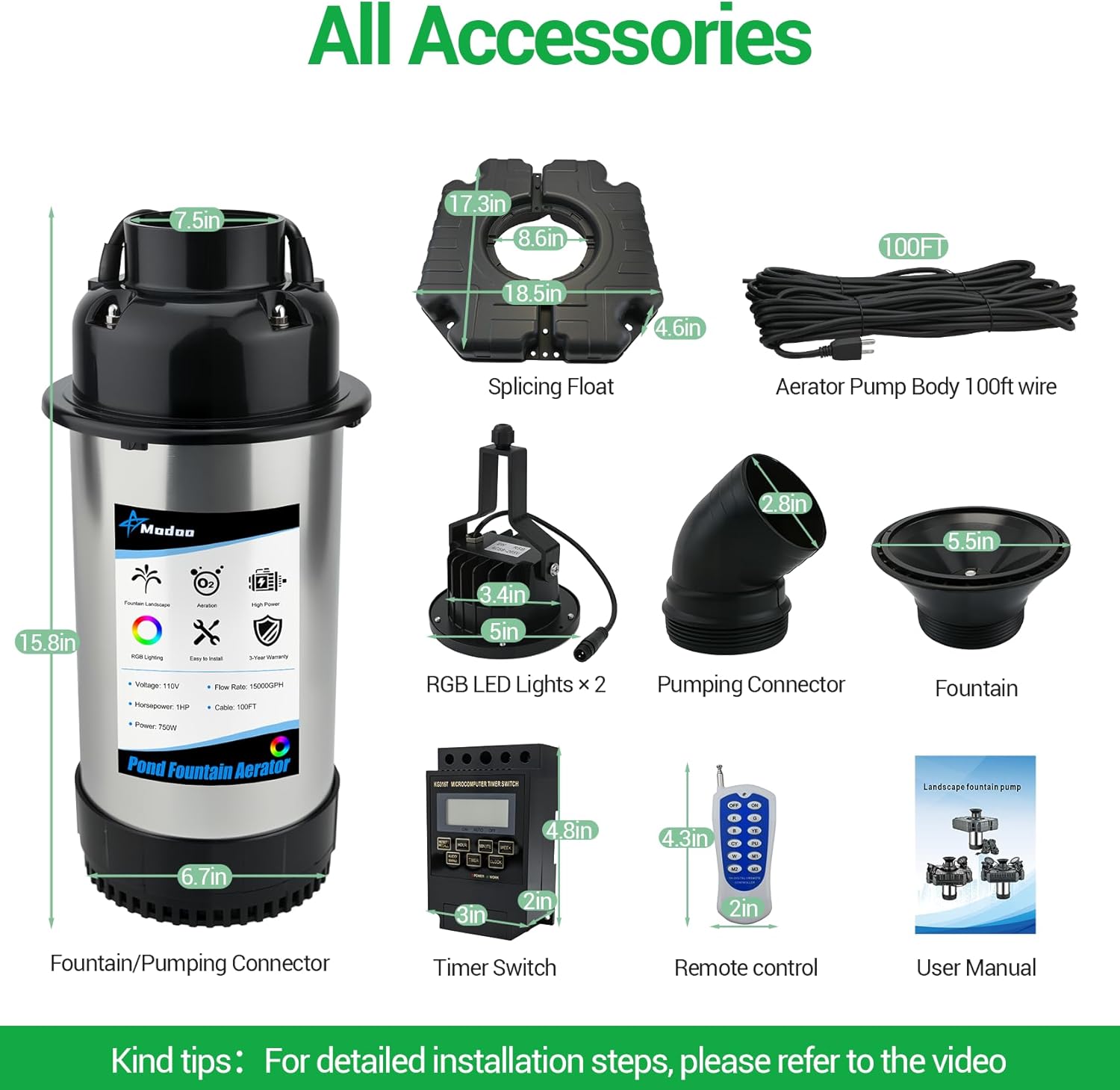 - [Powerful Performance]: Our 1HP 110V lake aerator fountain is suitable for ponds, fishponds, and lakes of all sizes. This floating pond aerator boasts a powerful 15,000 gph, 750 watts of power. It also comes with a 100-foot power cord, allowing you to adjust the fountain aeratorโs position in the lake as you wish. Combining intelligent technology with efficient aeration, this floating fountain aerator not only improves water quality but also delivers an impressive visual experience.
