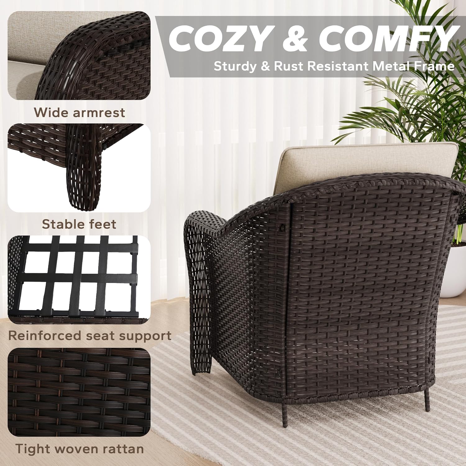 - Sturdy and Durable: The outdoor furniture set is made of steel frame and PE wicker, ensuring that it will be more sturdy. Fade-resistant fabrics of cushions is stain & fade resistance, tear & wear resistance
