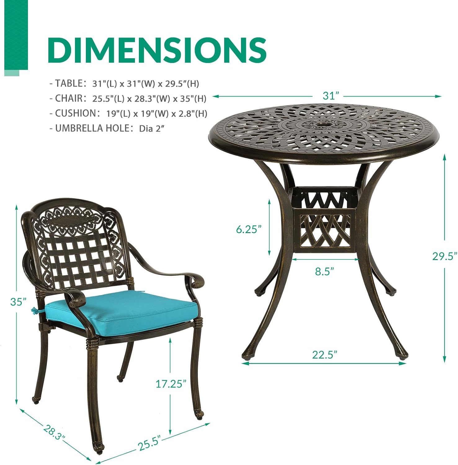 - 【SET DIMENSIONS】 - Table Dimensions: Dia31"x 29.5"(H); Chair Dimensions: 25.5"(L) x 28.3"(W) x 35"(H); Cushion Dimensions: 19"(L) x 19"(W) x 2.8"(H); Umbrella hole: Dia 2"; Weight Capacity of Table: 165 lbs; Weight Capacity of Each Chair: 350 lbs