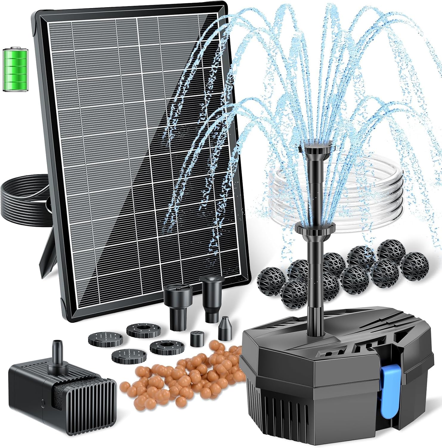 - 【Solar Powered with Battery Backup】This solar fountain pump boasts a powerful 8W solar panel AND built-in 3000mAh battery backup, ensuring continuous operation even on cloudy days. Say Goodbye to Intermittent Fountains! (Note: This solar fountain does not operate at night.)